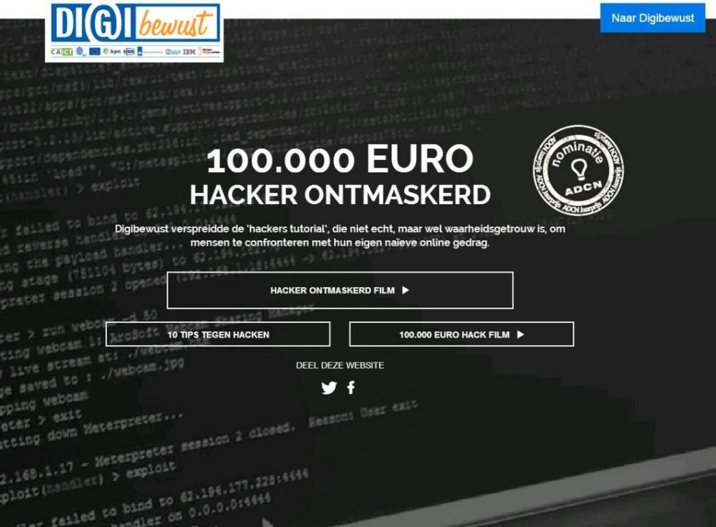 Op 31 maart vond in Paradiso in Amsterdam de uitreiking van de 47e ADCN Jaarprijzen voor Reclame en Vormgeving plaats. De hackerfilm 100.000 euro van Digibewust heeft de zilveren Lamp 2014 gewonnen in de categorie Online Adverteren.