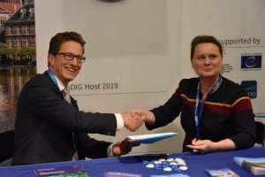 De jaarlijkse Europese multistakeholder dialoog over Internet Governance, EuroDIG, vindt volgend jaar in Nederland plaats in Den Haag op 19 en 20 juni 2019. Ter bekrachtiging daarvan werd in de marge van IGF2018 de Host Country Agreement medeondertekend door de SG van EuroDIG, Sandra Hoferichter, in het bijzijn van Geert Moelker (EZK) namens het gastland.